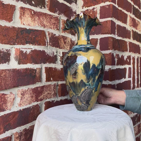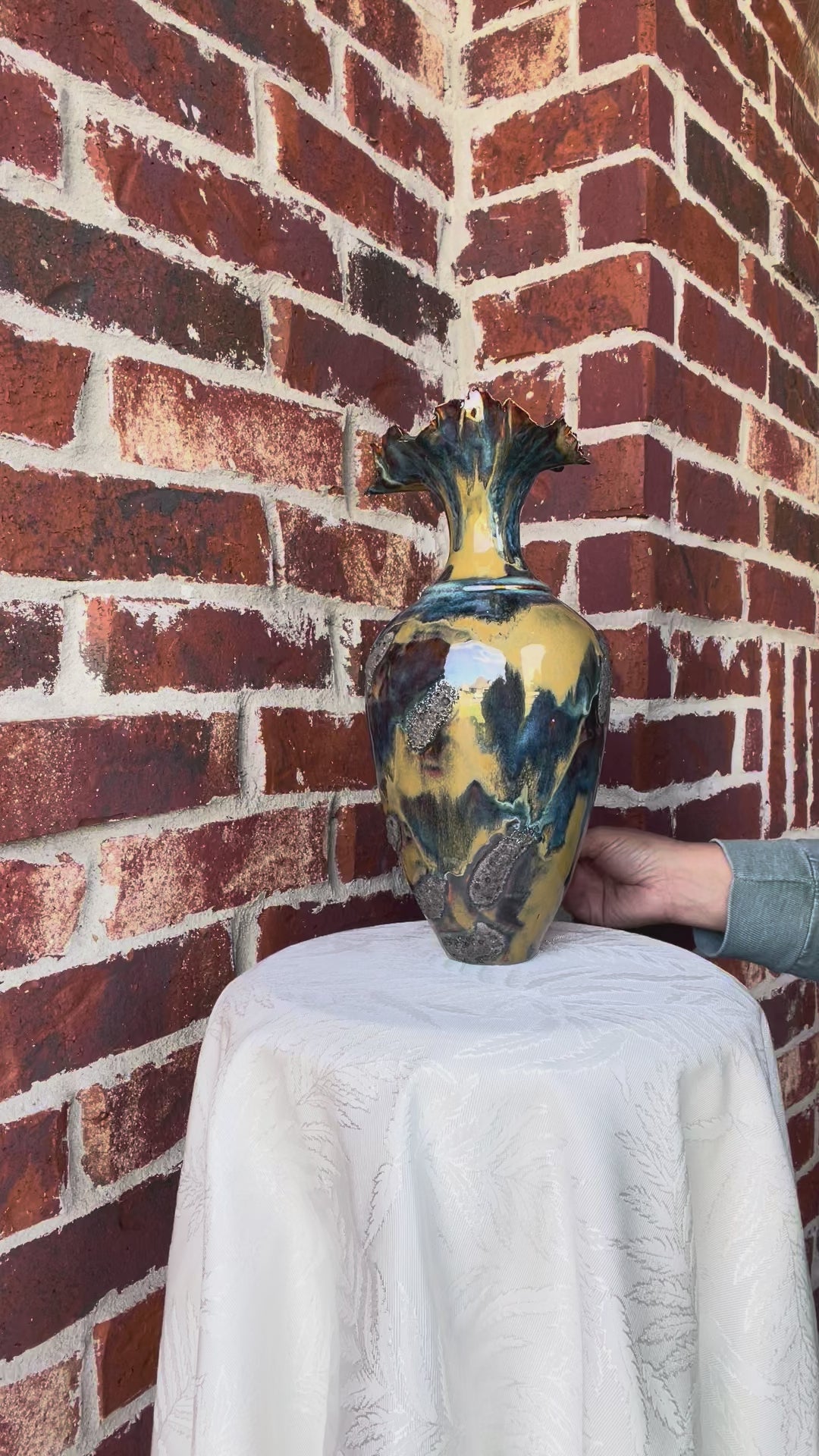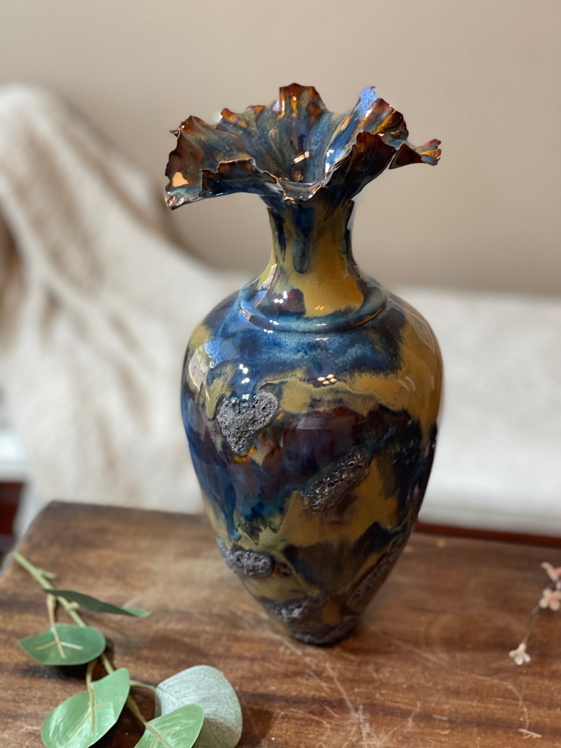 Layered glazes in natural stone tones of soft blue, mossy green and earthy browns give the vessel a river rock finish that feels organic and enduring. The contoured porcelain clay creates an elegant silhouette, while the textured glaze invites touch and adds depth.